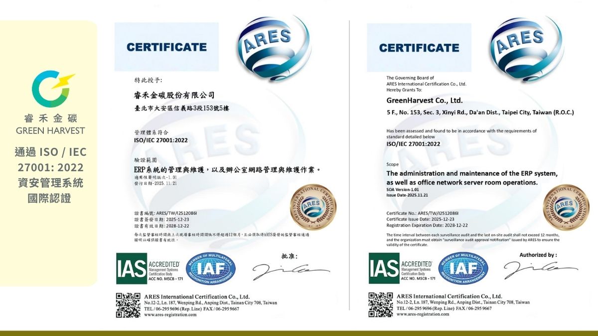 睿禾金碳於 2025 年 12 月中通過第三方驗證機構之稽核,正式取得 ISO / IEC 27001 : 2022 資訊安全管理系統(ISMS)證書,代表本公司在資訊安全治理、風險管理、營運持續與持續改善等面向,已建立充份安全,並且經得起檢驗的管理系統。